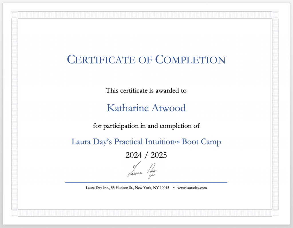I have also studied with Laura Day while completing her rigorous Intuition training referred to as bootcamp. Read more about Laura here.